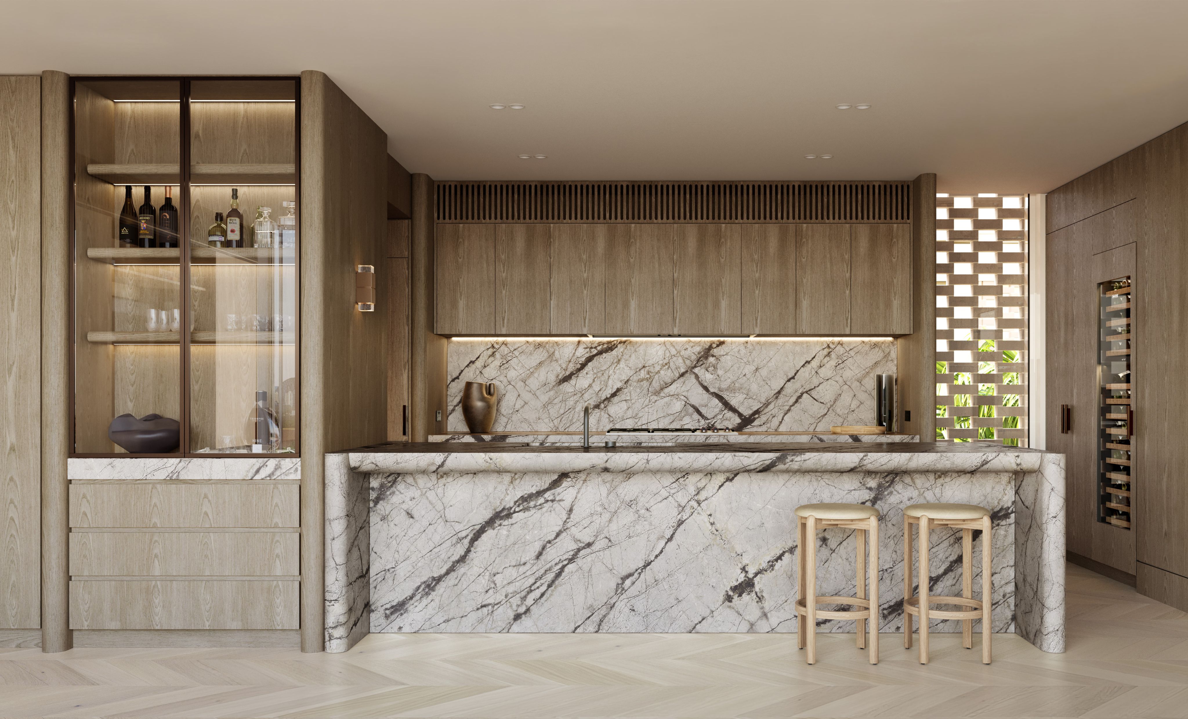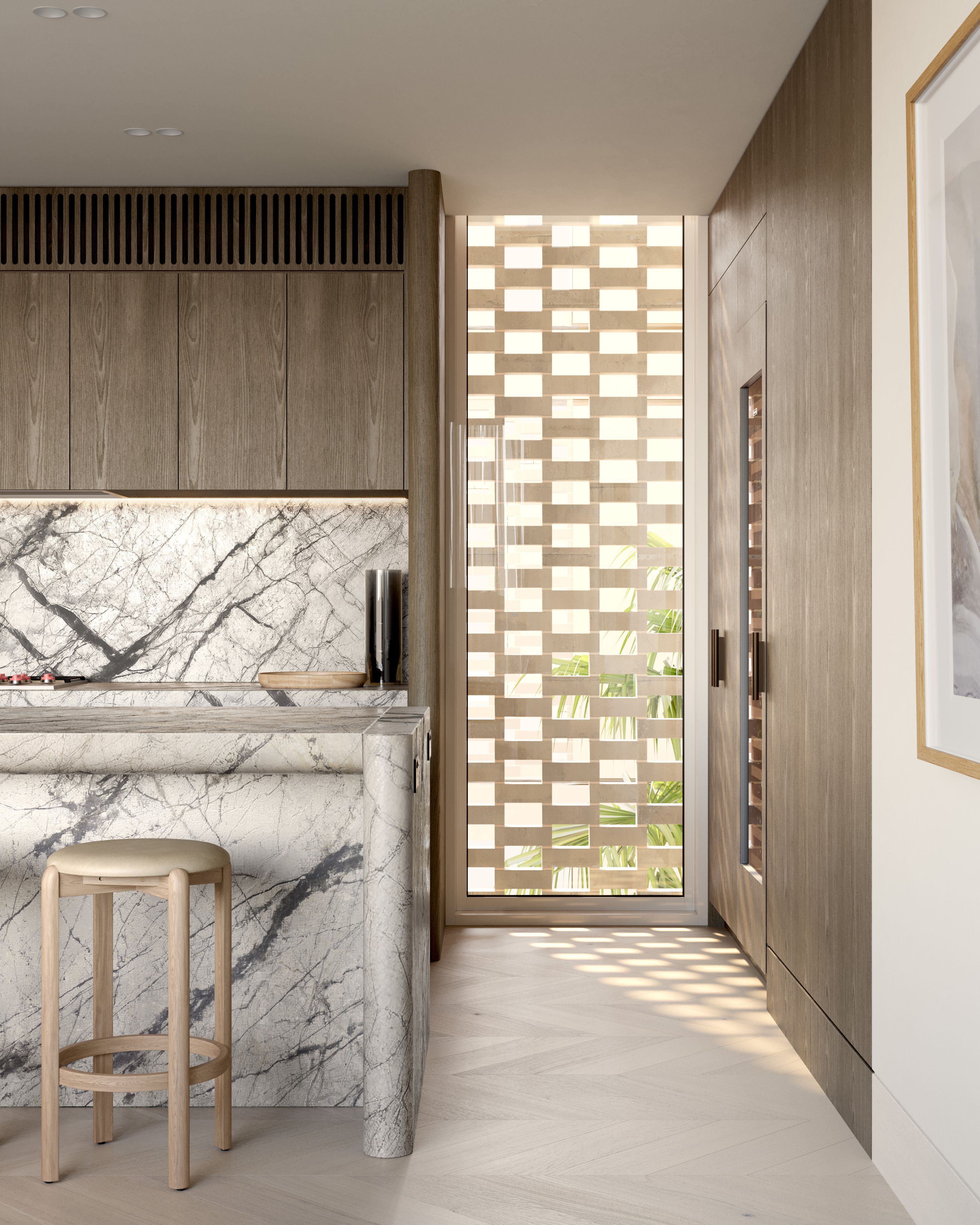 Natural stone and elegant chevron timber flooring throughout form the foundation of this interior palette, adding depth and character through the interplay of soft and hard, smooth and textured finishes.