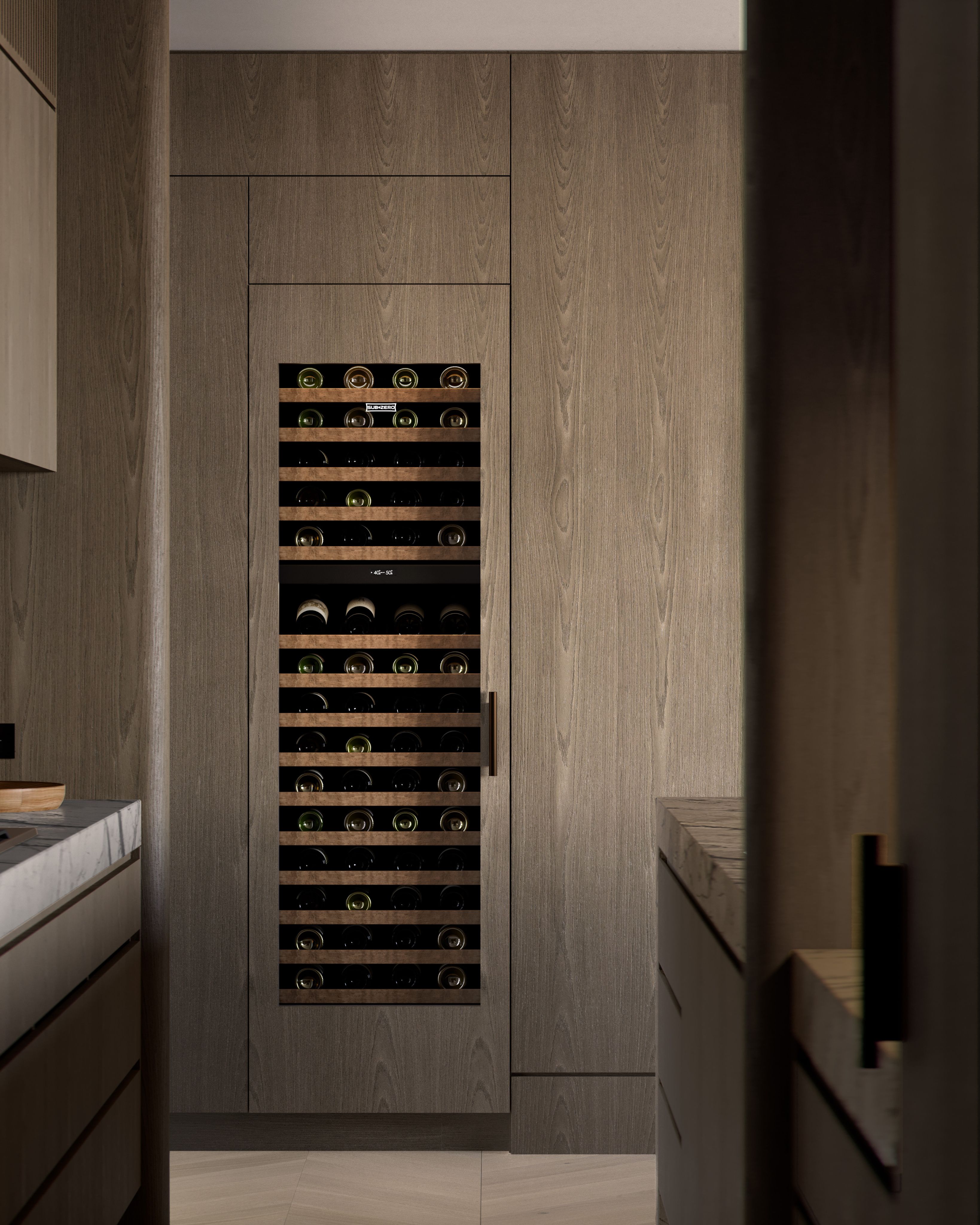 An integrated wine fridge keeps your collection at cellar perfection — ideal for entertainers, quiet family gatherings, or collectors showcasing their finest drops.